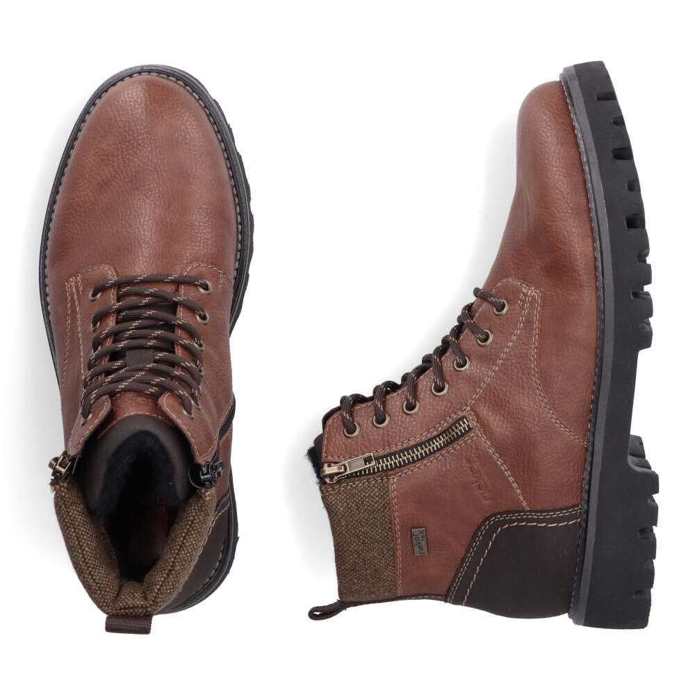 Tento zimní model pánské kotníkové obuvi značky Rieker Vás ohromí na první pohled nejen svým vzhledem, ale také funkčností. Designový vzhled si oblíbí každý muž, který se rád obléká módně i v chladném zimním období. Hnědý svršek je doplněn o funkční zip, hnědou patu či textilní zpracování horní části obuvi. Zip se nachází také na vnitřní straně, kde slouží ke snadnému obutí a šňůrkami si pak kotníky přizpůsobíte na nohu podle potřeby. Nejen svým vzhledem jsou tyto boty značky Rieker zajímavé. K dokonalosti jim pomáhá také hřejivá podšívka z ovčí vlny, měkká stélka či speciální texová membrána chránící před vlhkostí. V tomto stylovém modelu se budete cítit komfortně po celý den.