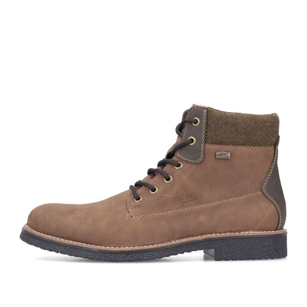 Detailní informace Tyto pánské boty RIEKER jsou opravdu dokonalým kouskem díky jejich nadčasovému designu a praktickým vlastnostem. Hnědý svršek je obohacen nepromokavou membránou pro pocit sucha v každém počasí a zateplení ovčí vlnou poskytne potřebné teplo v chladných dnech. Měkká stélka zajistí pohodlný pocit při chůzi, tlumící podešev podtrhne celkový design a sníží otřesy každým krokem. Nazutí je jednoduché díky zipu umístěnému na boční části a šněrováním si boty upravíte k dokonalému pohodlí. Tyto boty jsou skvělou volbou pro každého, kdo hledá kombinaci stylu, pohodlí a funkčnosti ve své obuvi.