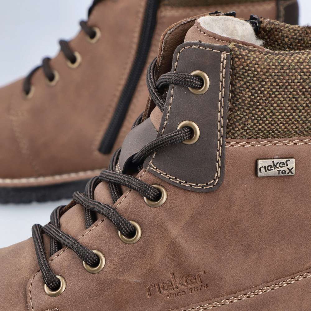 Tyto pánské boty RIEKER jsou opravdu dokonalým kouskem díky jejich nadčasovému designu a praktickým vlastnostem. Hnědý svršek je obohacen nepromokavou membránou pro pocit sucha v každém počasí a zateplení ovčí vlnou poskytne potřebné teplo v chladných dnech. Měkká stélka zajistí pohodlný pocit při chůzi, tlumící podešev podtrhne celkový design a sníží otřesy každým krokem. Nazutí je jednoduché díky zipu umístěnému na boční části a šněrováním si boty upravíte k dokonalému pohodlí. Tyto boty jsou skvělou volbou pro každého, kdo hledá kombinaci stylu, pohodlí a funkčnosti ve své obuvi. Technologie: Antistress – díky čtyřem antistresovým vlastnostem – lehkosti, pružnosti, prostornosti a vynikající absorpci nárazů – vám boty RIEKER nabídnou komfortnější chůzi. Rieker TEX – funkční vrstva, díky které je bota nepromokavá a přesto prodyšná. Podšívka je vyrobena z pravé ovčí vlny.