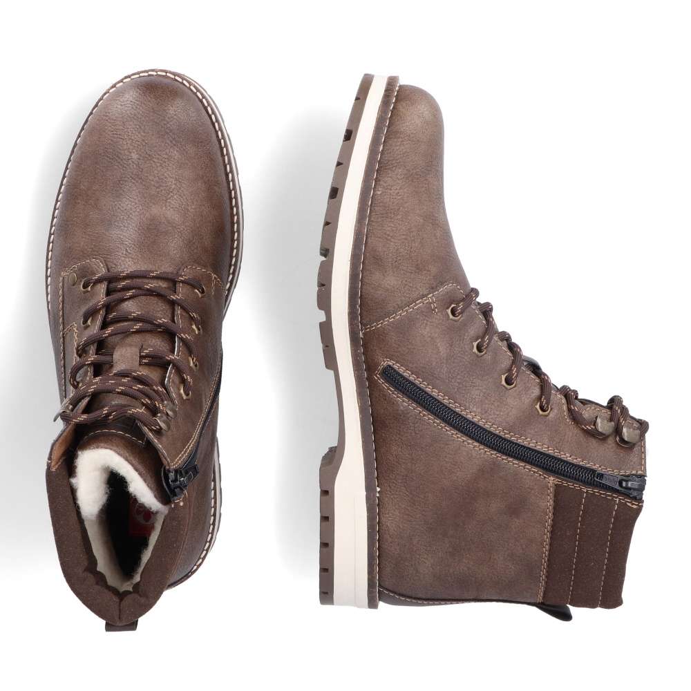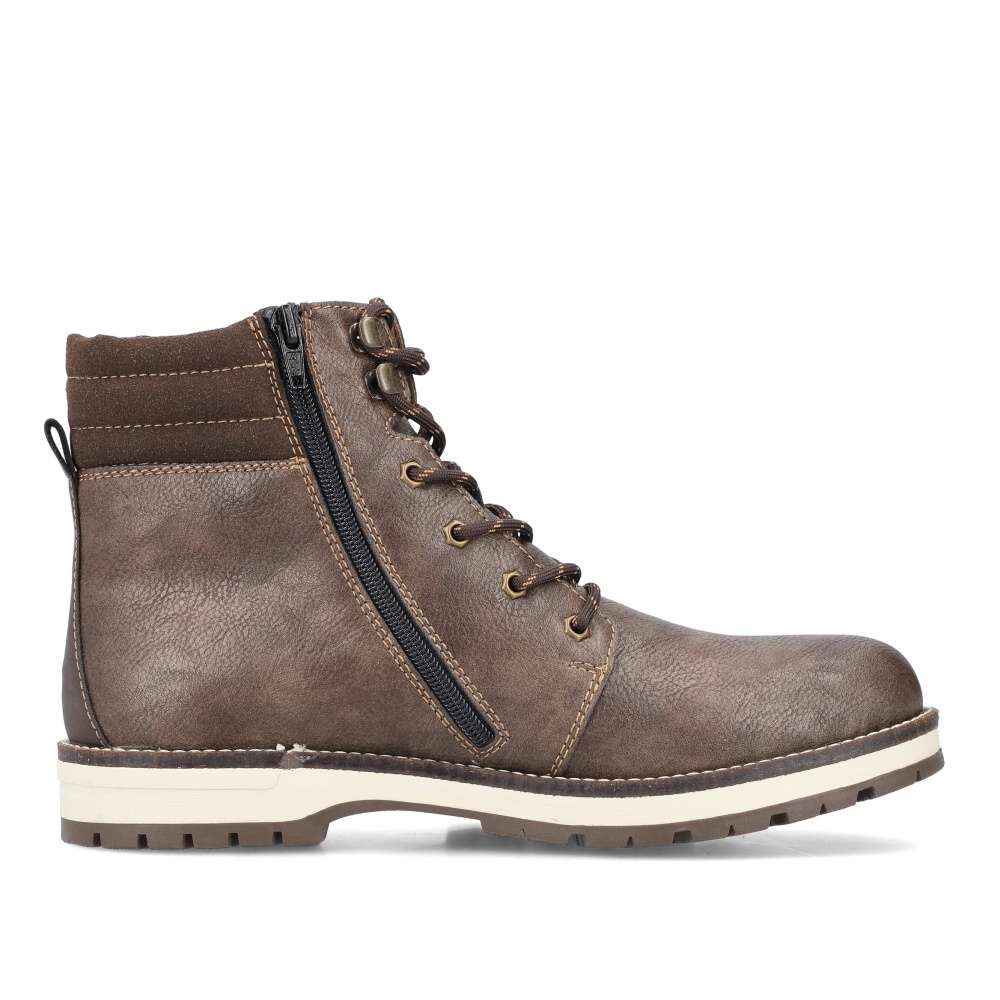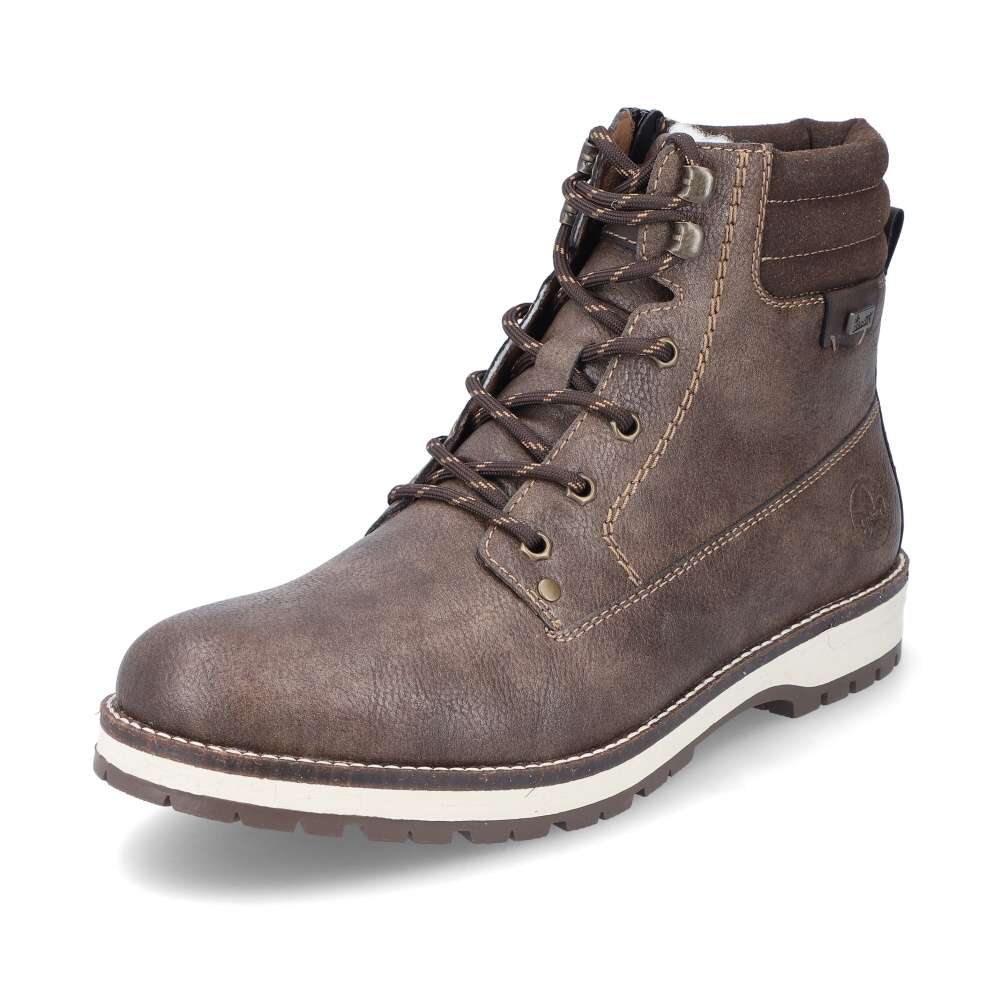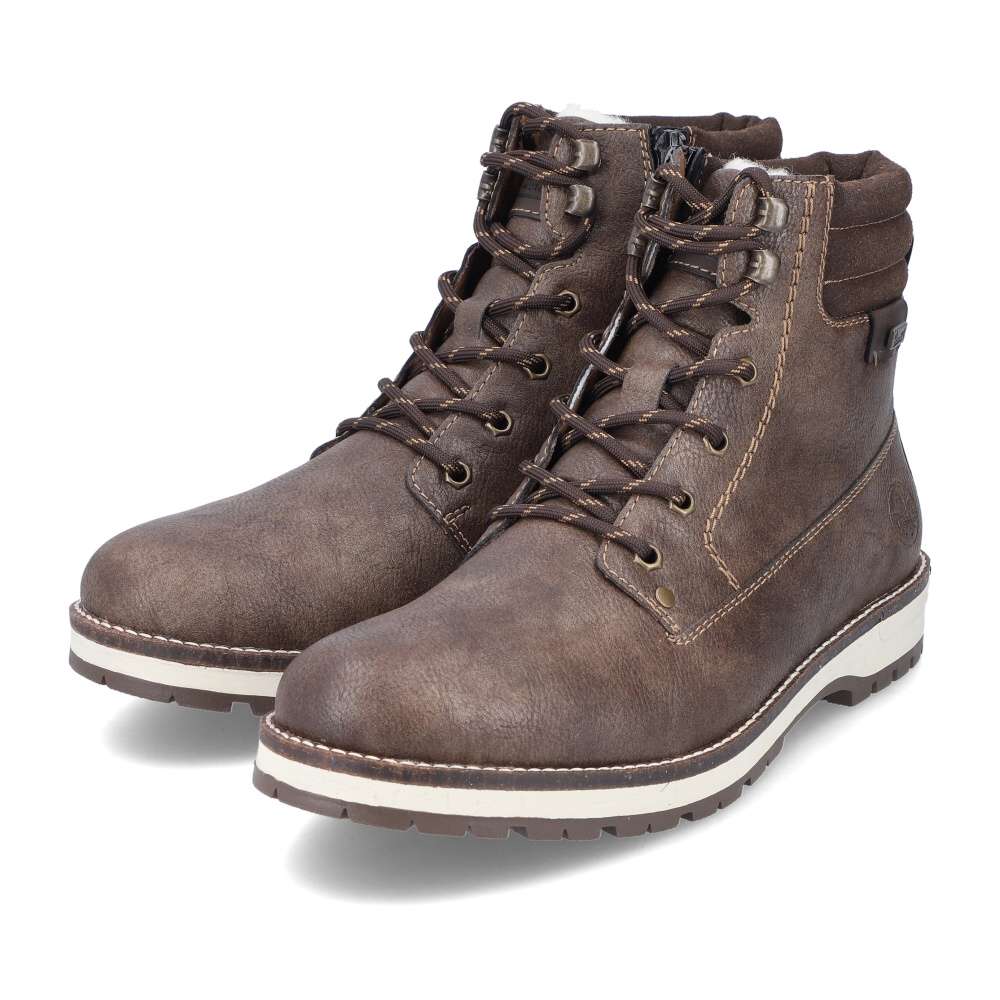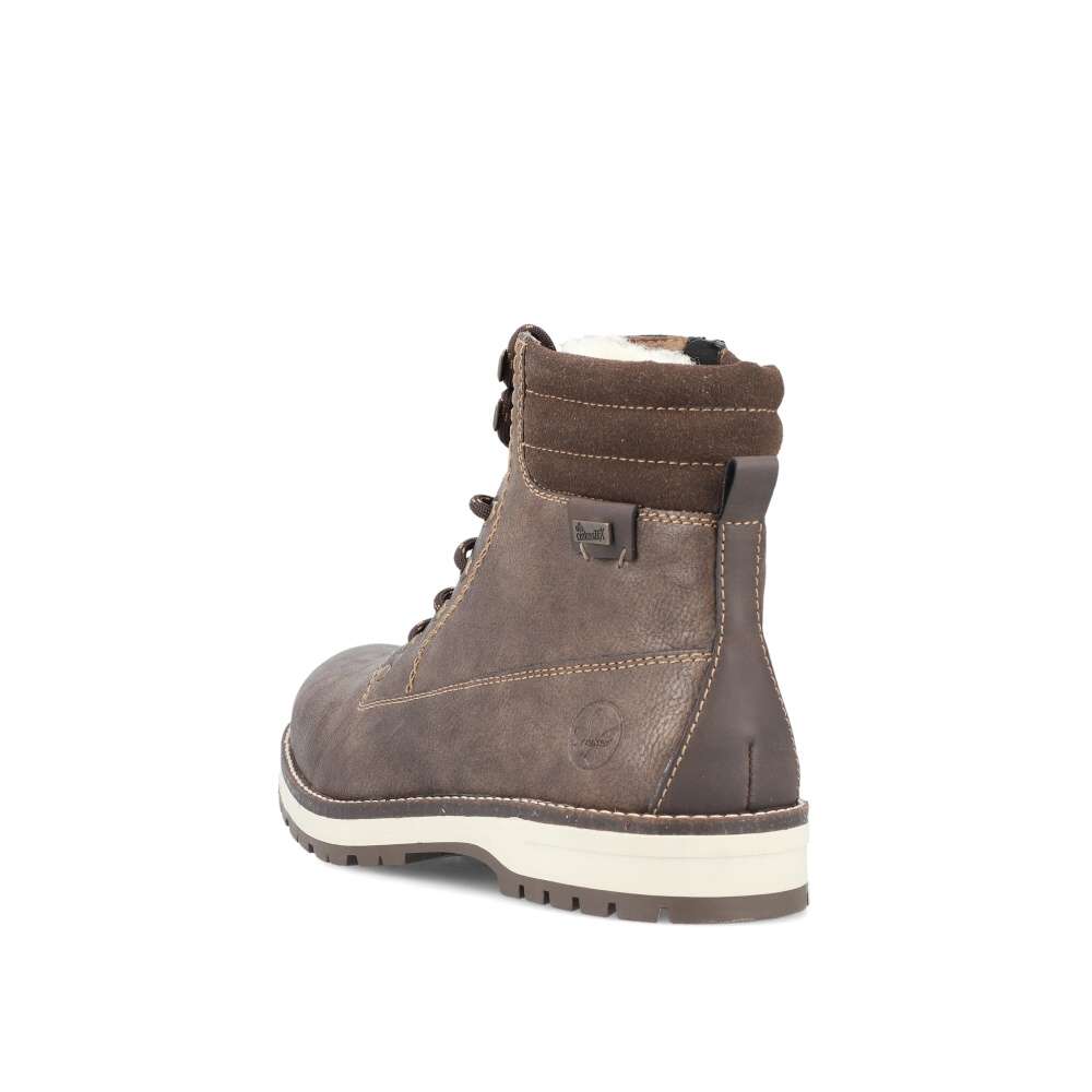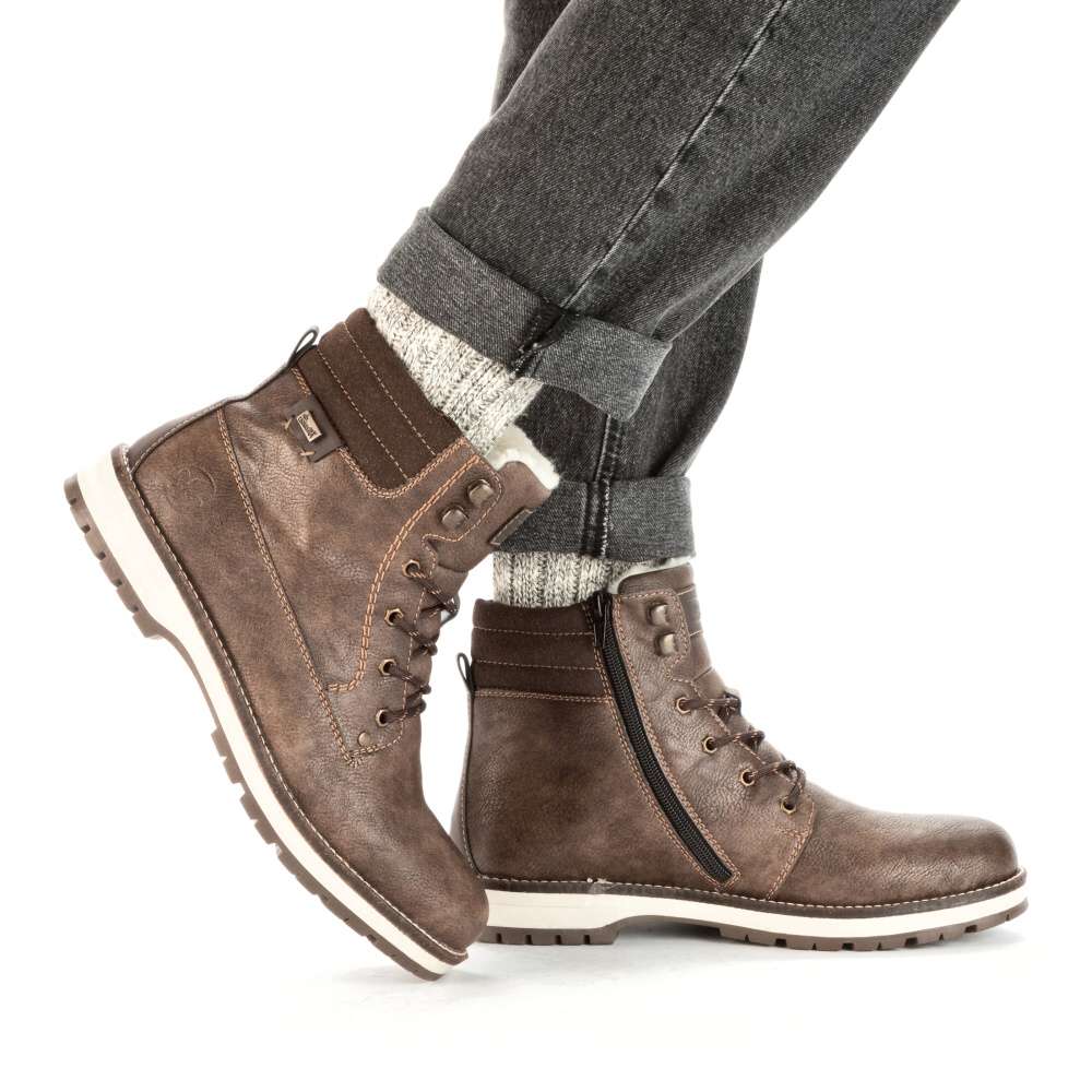 Tato pánská zimní kotníková obuv značky Rieker je vzhledem ke své jednoduchosti, a přesto trendovosti, ideálním doplňkem do Vašeho šatníku. Svršek v módní hnědé barvě je doplněn o barevně odlišené díly kolem kotníku, a je kontrastně sladěn s bílou podešví. K uzavírání zde slouží funkční zip, tkaničkami si obuv upravíte na nohu dle potřeby tak, aby sedla jako ulitá a ochránila Vás tak před sněhem a chladem. K tomu dopomáhá také podšívka vyteplená pravou ovčí vlnou a speciální TEX membrána, díky které budete v suchu i při vycházce sněhem. Tento model Vám bude ideálním doplňkem jak do města, tak do přírody. Technologie: Antistress – podešev je díky této technologii lehká, flexibilní, absorbuje nárazy při došlapu a snadno se přizpůsobí každé noze. Rieker TEX – funkční vrstva, díky které je bota nepromokavá a přesto prodyšná. Podšívka je vyrobena z pravé ovčí vlny.