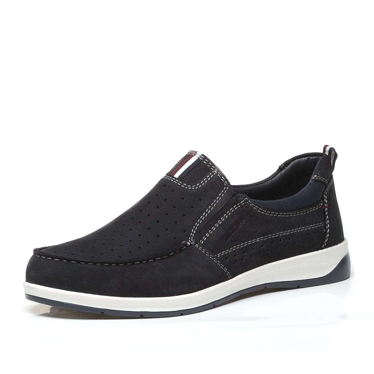Tyto mokasíny z broušené kůže oceníte v teplejších měsících. Zdobnými prvky jsou povrchová perforace, kontrastní prošívání a snadné nazouvání umožňují pružné gumičky všité po stranách obuvi. Můžete v nich vyrazit do práce, ale i na procházku do města. Skvěle budou vypadat k lehkým plátěným kalhotám.