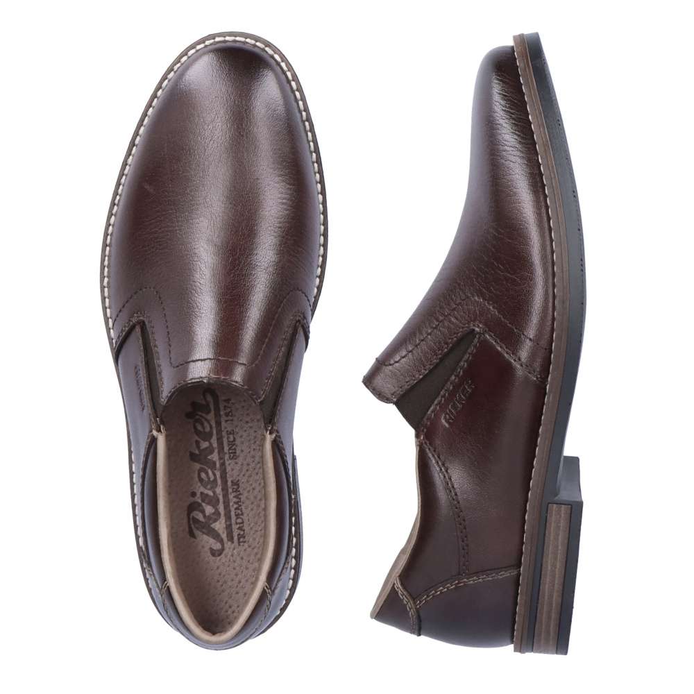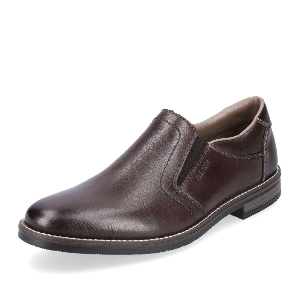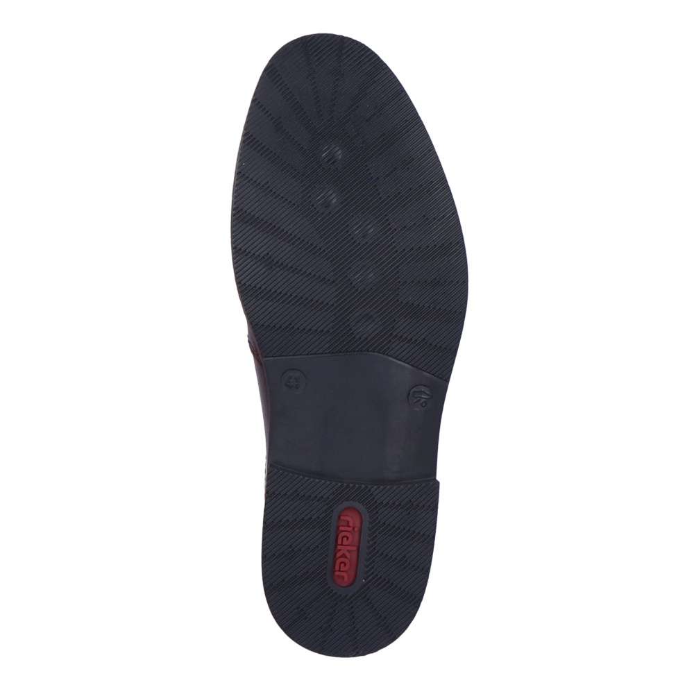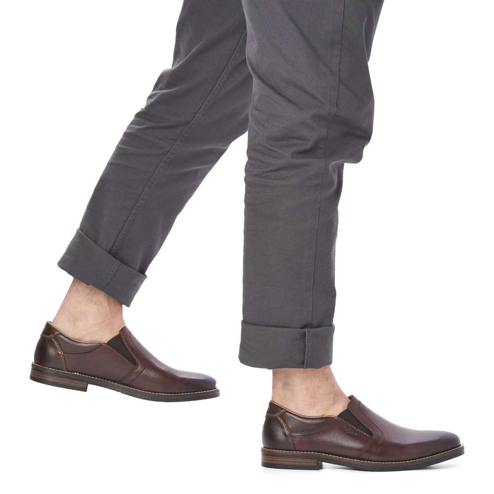 Tato pánská společenská polobotka od značky RIEKER má hladký svršek v tmavě hnědé barvě vyrobený převážně z přírodní usně. Na první pohled zaujme lemovanou podešví a podpatkem s hnědým pruhem. Z obou stran jazyka je vsazená guma, díky které se boty lehce přizpůsobí Vašemu chodidlu. Pohodlí na každém kroku zajistí měkká stélka. Tento lehce kombinovatelný kousek doladí outfit každého muže. Technologie: Antistress – podešev je díky této technologii lehká, flexibilní, absorbuje nárazy při došlapu a snadno se přizpůsobí každé noze.