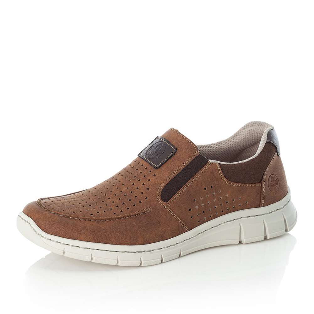 Tato pánská polobotka značky RIEKER Vás na první pohled zaujme barevnou kombinací hnědé a tmavě hnědých doplňků.