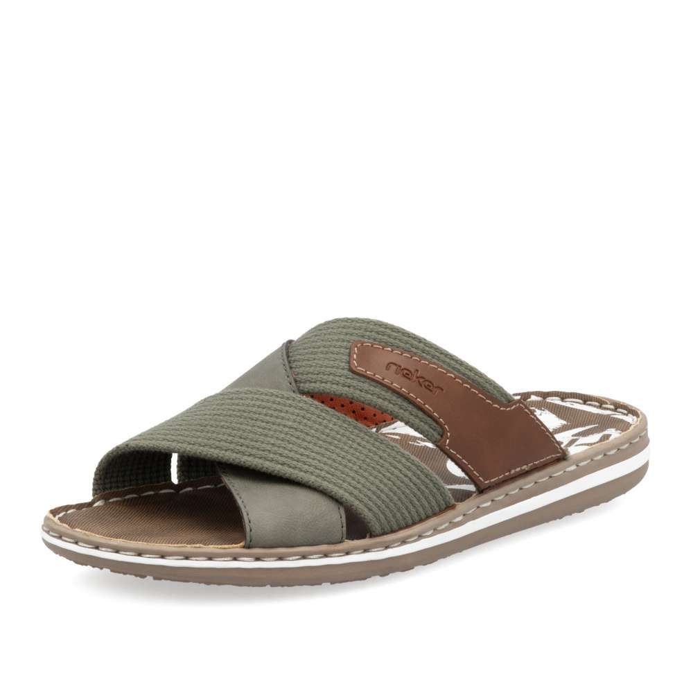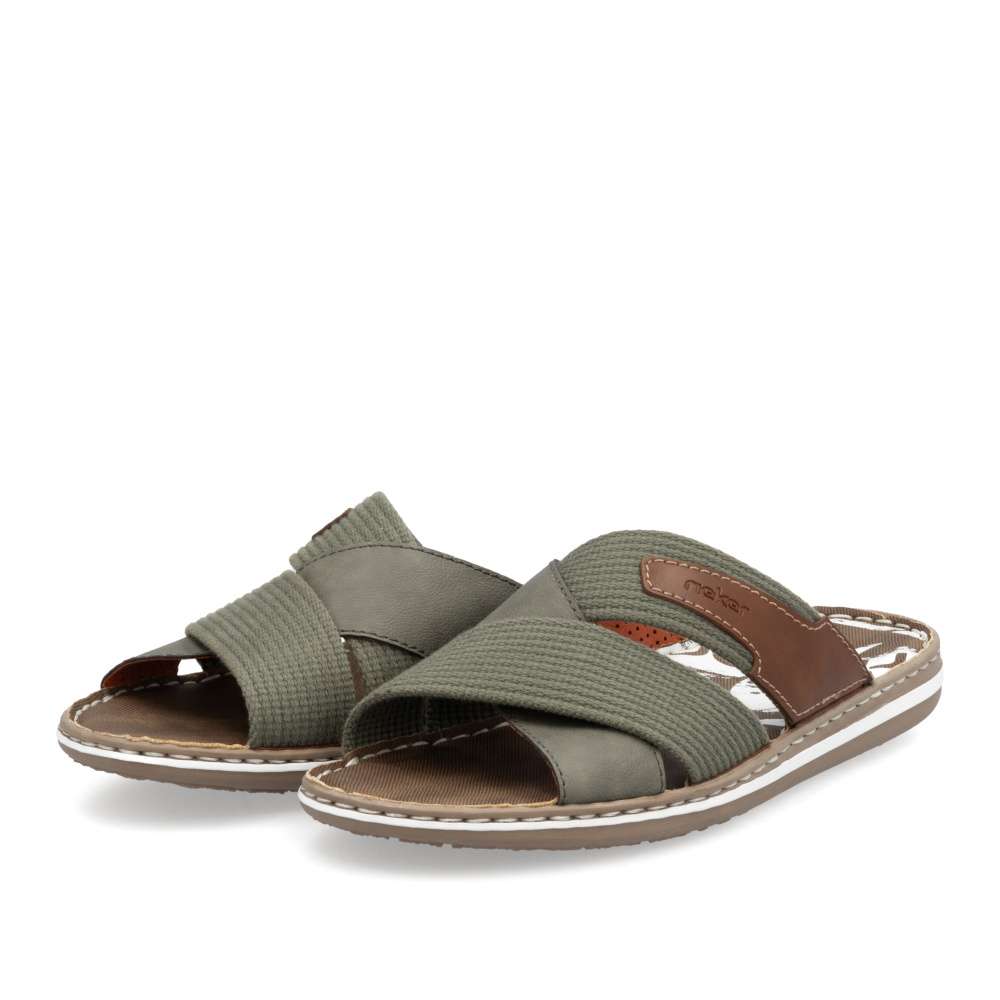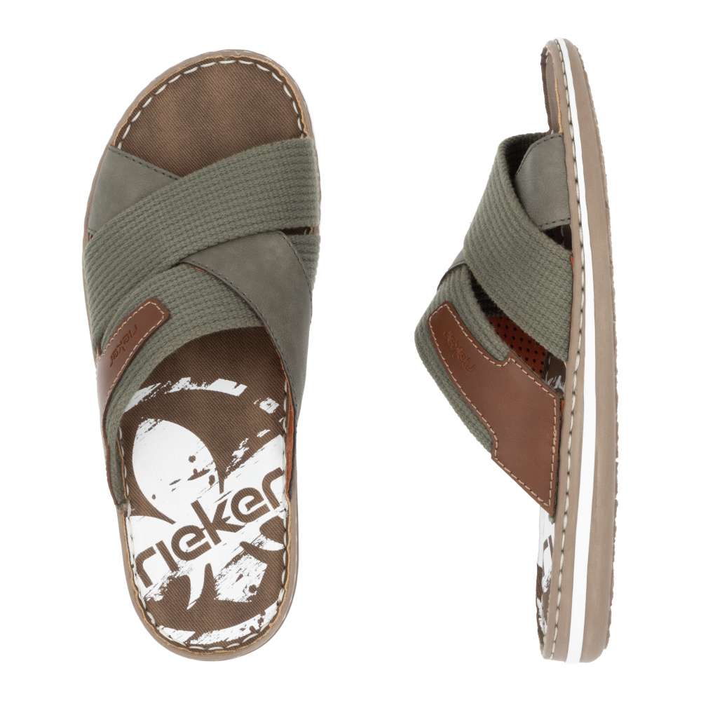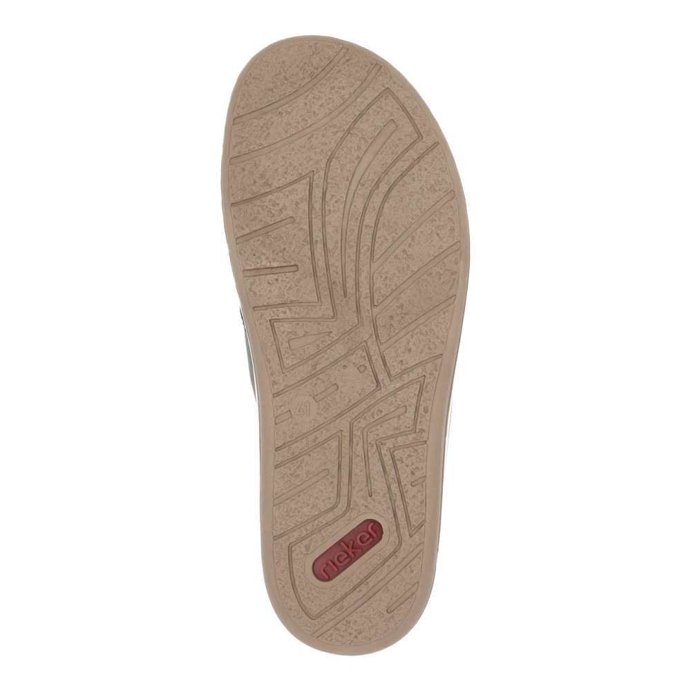 Moderní vzhled těchto nazouváků značky RIEKER zajistí, že je snadno sladíte s Vašimi letními outfity. Svršek obuvi je šikovně poskládán z textilních a hladkých pásků a ozdoben je hnědou nášivkou s názvem značky. Měkká stélka zajistí pohodlí na každém kroku a kvalitní pruhovaná podešev je ozdobena šitím. Procházky kolem moře budou v tomto modelu radost. Technologie: Antistress – podešev je díky této technologii lehká, flexibilní, absorbuje nárazy při došlapu a snadno se přizpůsobí každé noze.