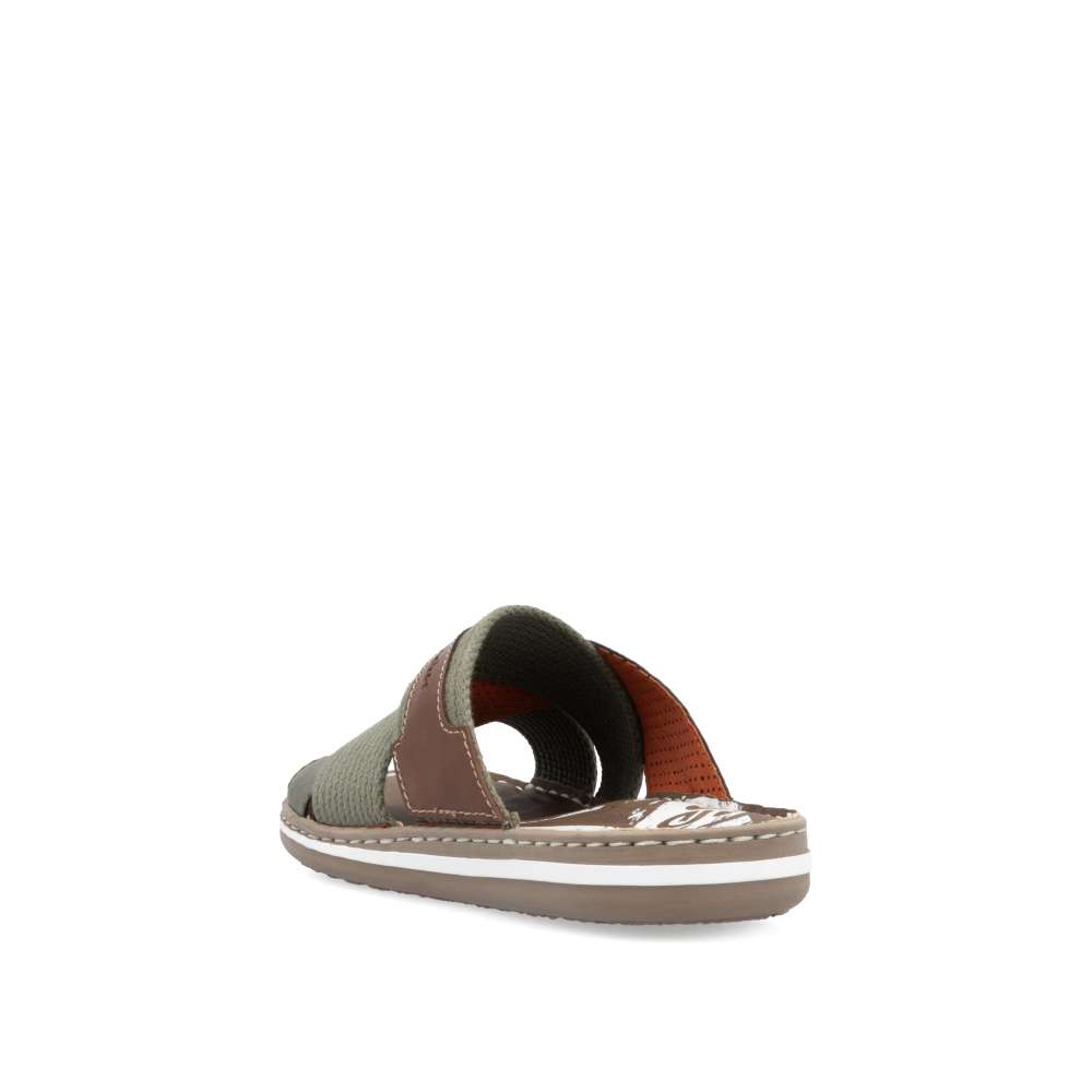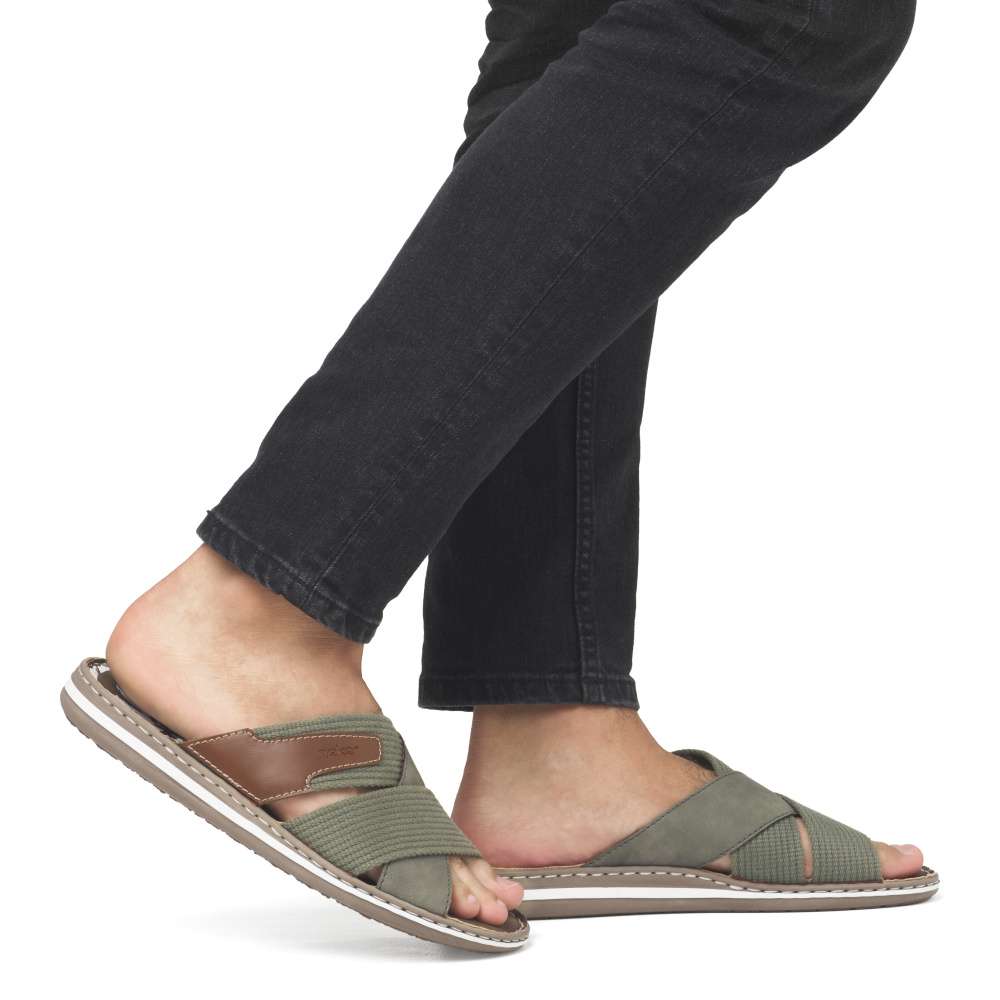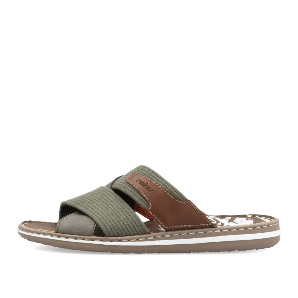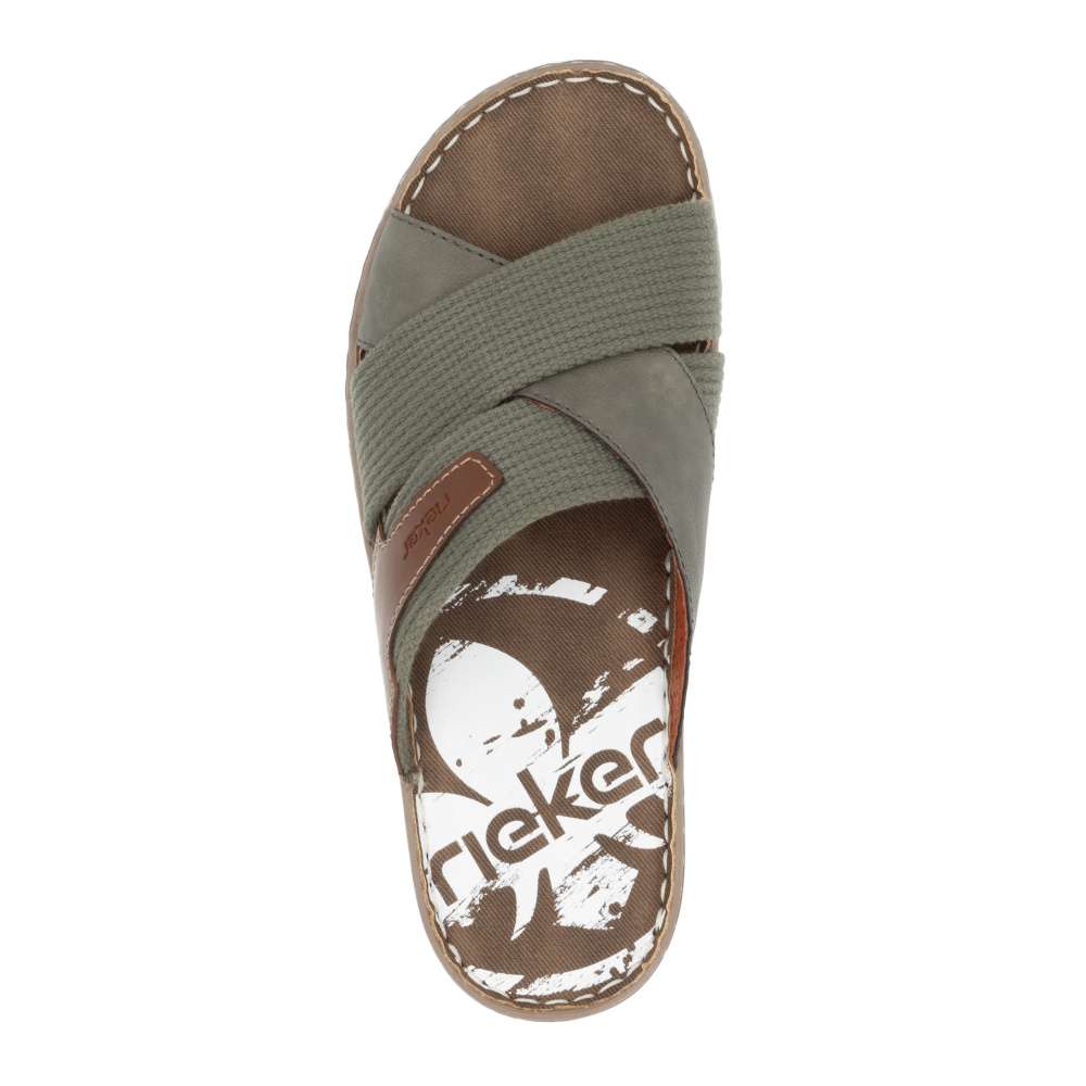 Moderní vzhled těchto nazouváků značky RIEKER zajistí, že je snadno sladíte s Vašimi letními outfity. Svršek obuvi je šikovně poskládán z textilních a hladkých pásků a ozdoben je hnědou nášivkou s názvem značky. Měkká stélka zajistí pohodlí na každém kroku a kvalitní pruhovaná podešev je ozdobena šitím. Procházky kolem moře budou v tomto modelu radost. Technologie: Antistress – podešev je díky této technologii lehká, flexibilní, absorbuje nárazy při došlapu a snadno se přizpůsobí každé noze.