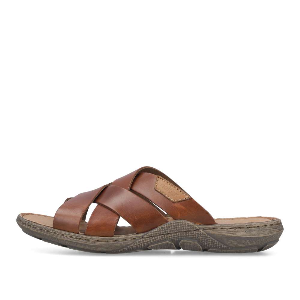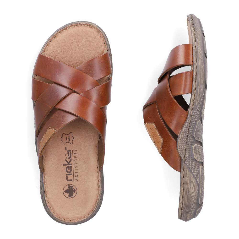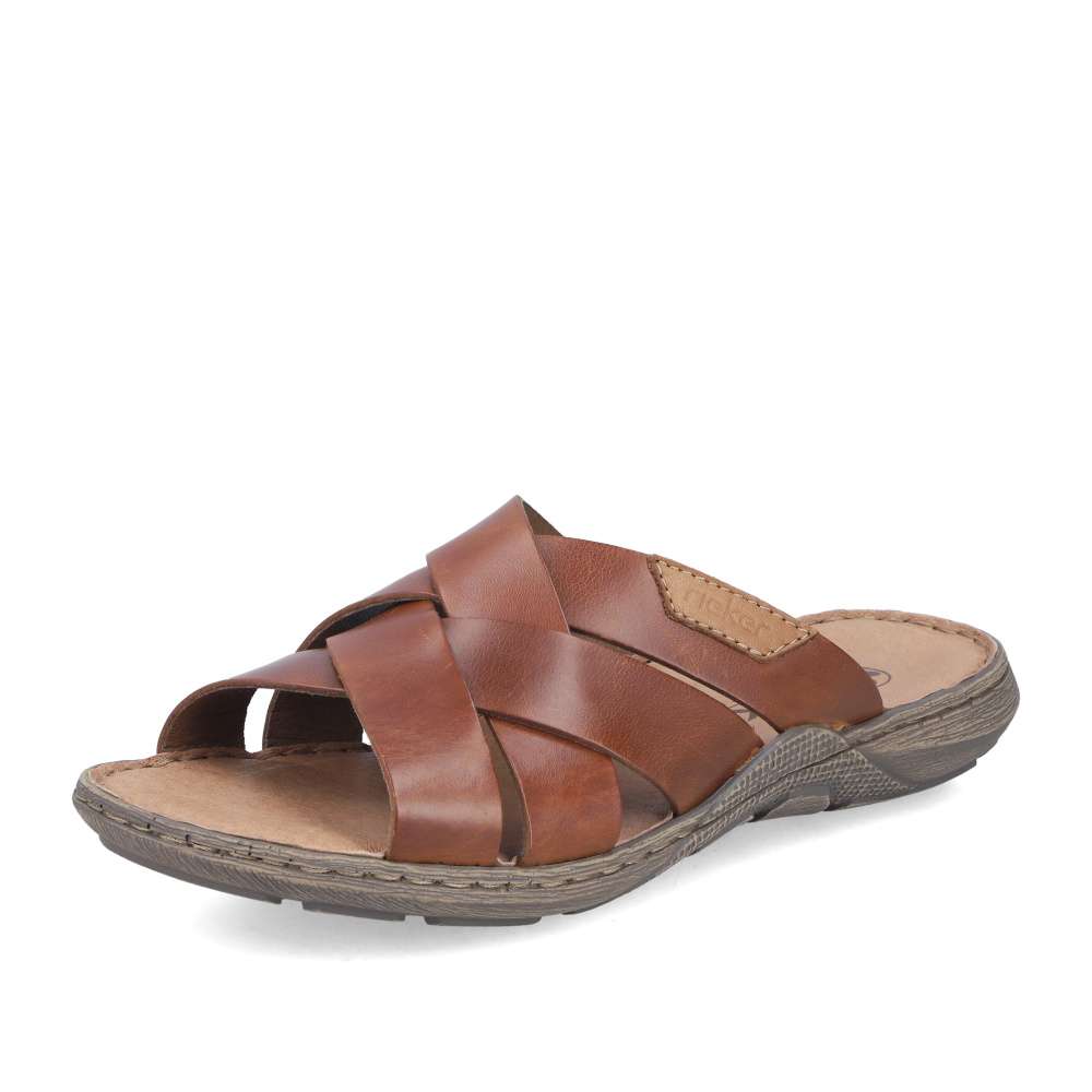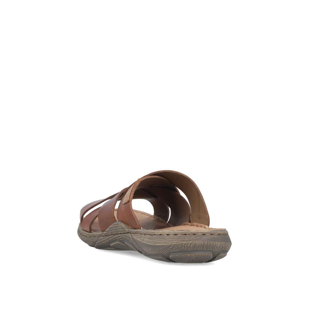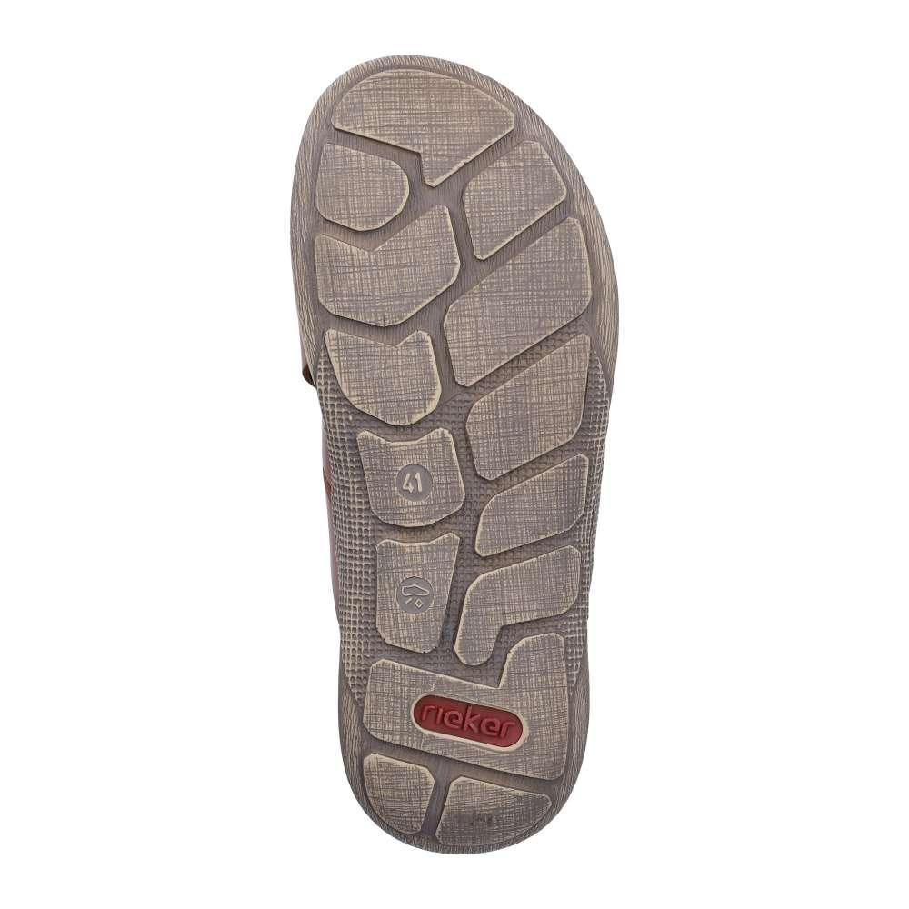 Tyto kožené nazouváky RIEKER v trendy hnědém odstínu jsou skvělou volbou pro muže, kteří si potrpí na komfort, kvalitu a styl. Svršek tvoří kombinace pásků, které jsou vizuálně atraktivně poskládané přes nárt a dekorovány logem značky, čímž nejen zajišťují pevné a stabilní usazení nohy, ale zároveň působí moderně. Měkká kožená stélka se dokonale přizpůsobí chodidlu a zaručí pohodlí i při delším nošení. Flexibilní podešev, typická pro značku RIEKER, je doplněna o prošití, které nejenom zvyšuje její odolnost, ale zároveň tvoří charakteristický designový prvek. Díky technologii tlumení nárazů se nazouváky postarají o přirozený pohyb během chůze, což oceníte zejména při každodenním nošení. Nadčasový vzhled těchto pantoflí zaručí jednoduché kombinování – perfektně se hodí k šortkám, plátěným kalhotám i ležérním outfitům.