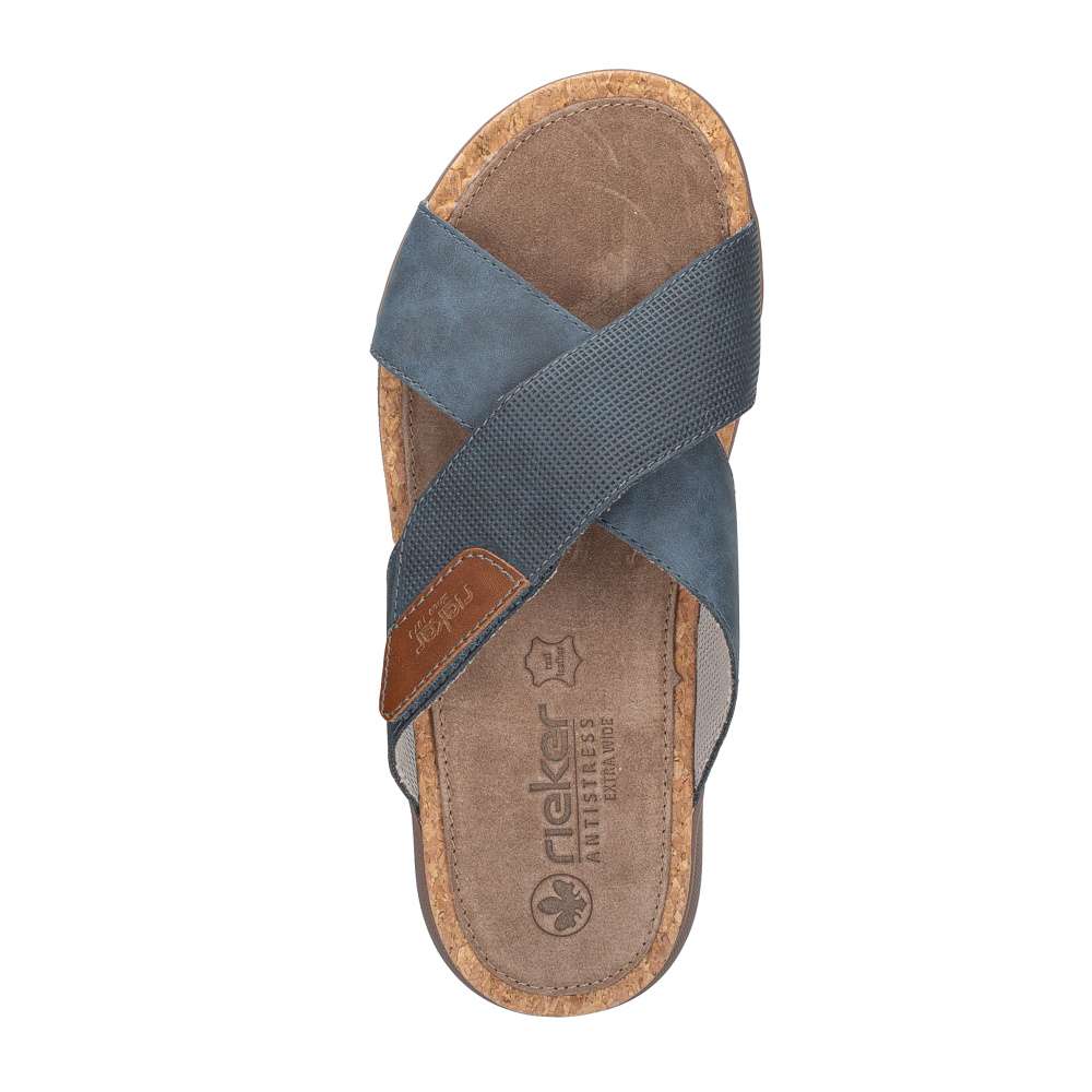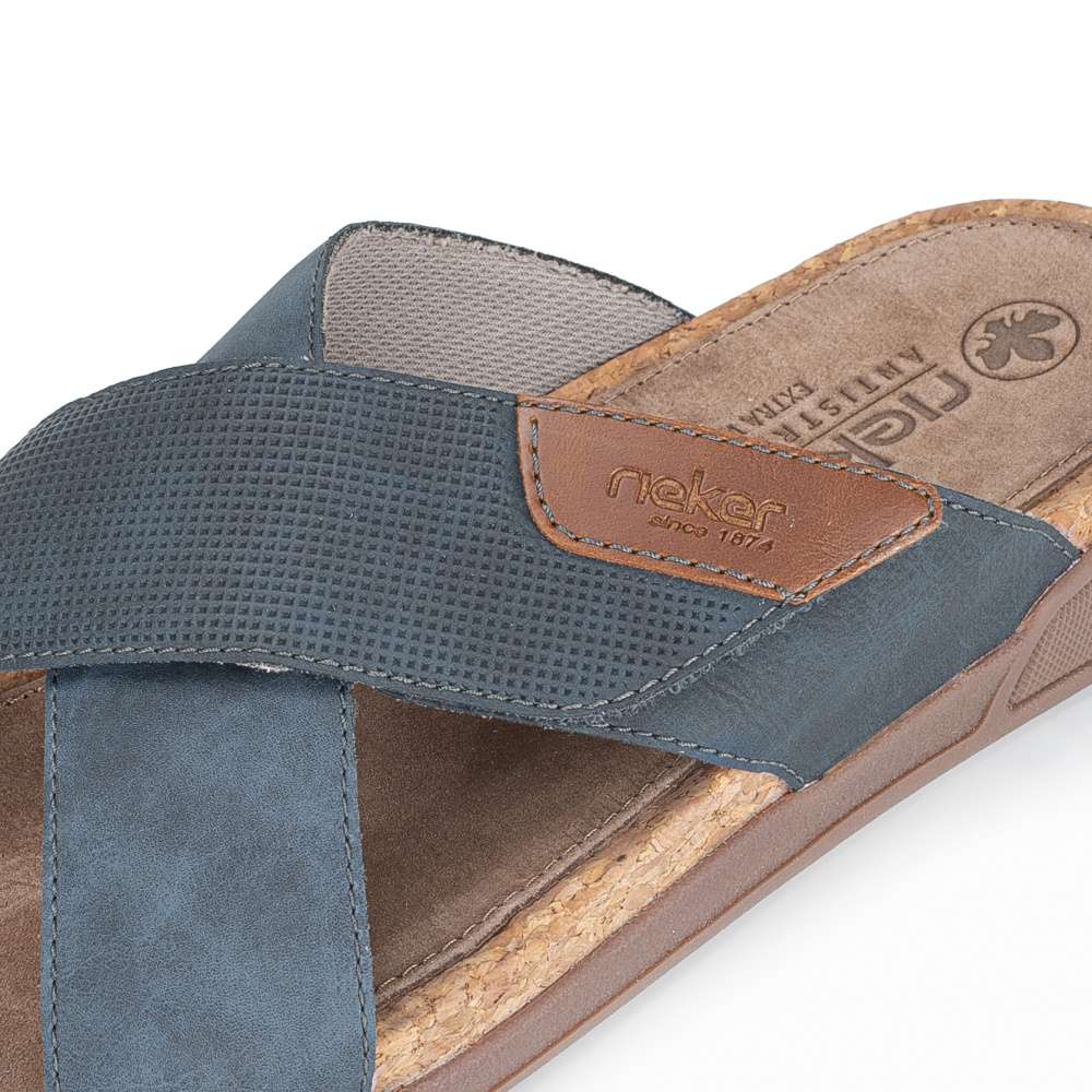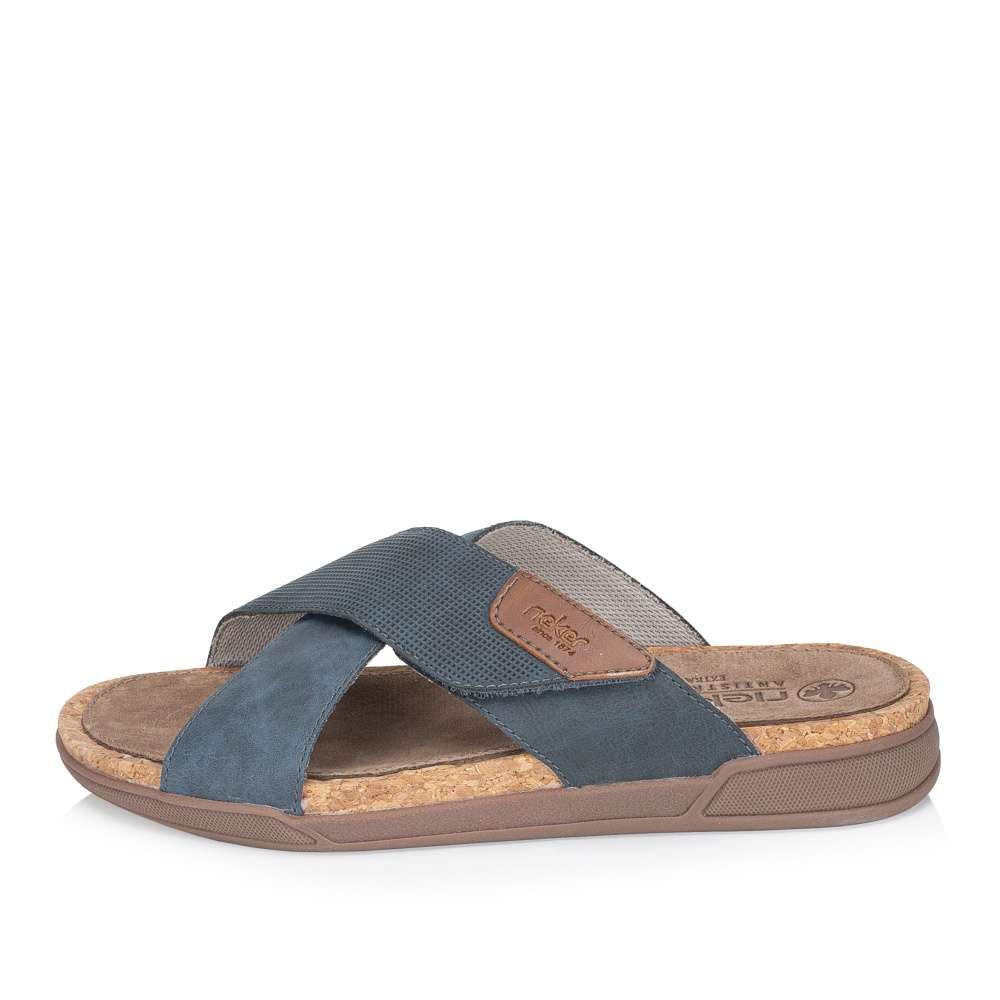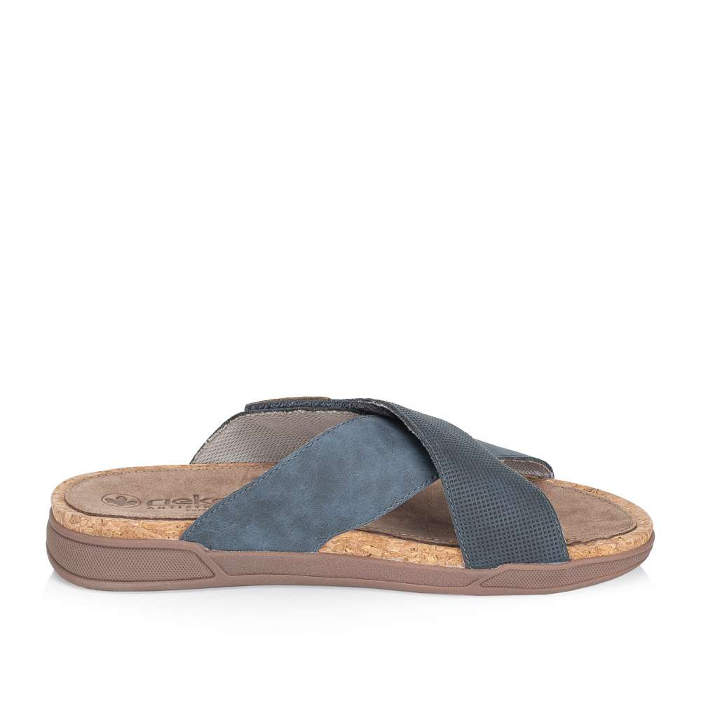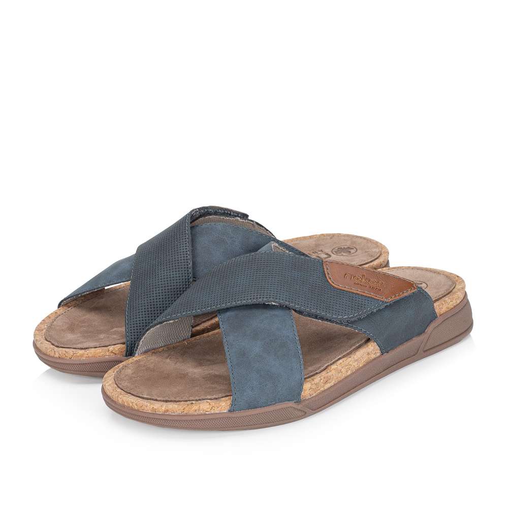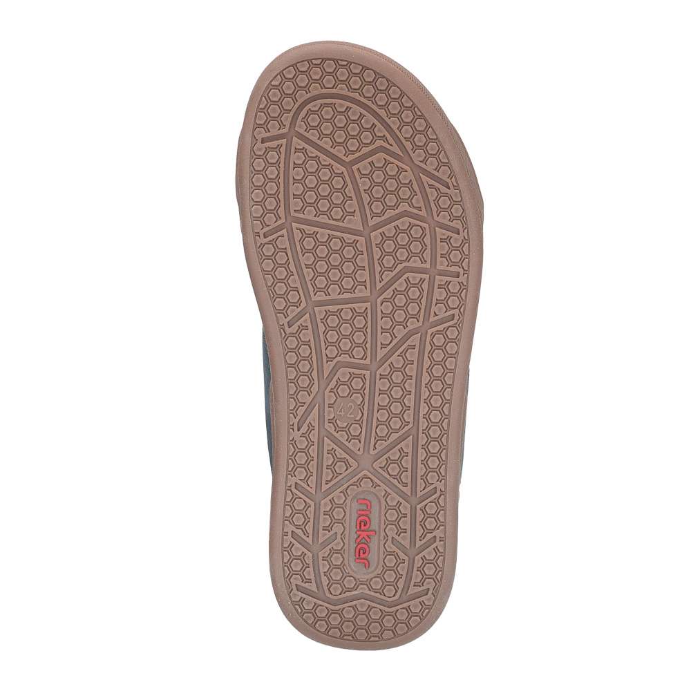 Tyto pánské nazouváky značky RIEKER spojují moderní vzhled s maximálním komfortem, čímž se stávají ideální volbou pro letní dny, dovolené i každodenní nošení. Svršek je efektně řešen poskládanými pásky přes nárt, z nichž jeden je opatřen suchým zipem pro snadné přizpůsobení tvaru nohy a pohodlné obouvání. Kombinace různých materiálových struktur spolu s nášivkou s logem značky dodává botám originální a dynamický vzhled. Kožená stélka a širší střih poskytují pohodlí při delším nošení, zatímco podešev s tlumením nárazů zaručuje stabilitu, jistotu při každém kroku a navíc působí vizuálně zajímavě. Tyto nazouváky stylově doplní různé letní outfity, ať už se jedná o ležérní šortky, plátěné kalhoty nebo pohodlné casual kombinace, přičemž spojují praktičnost, komfort a moderní design do jednoho celku.