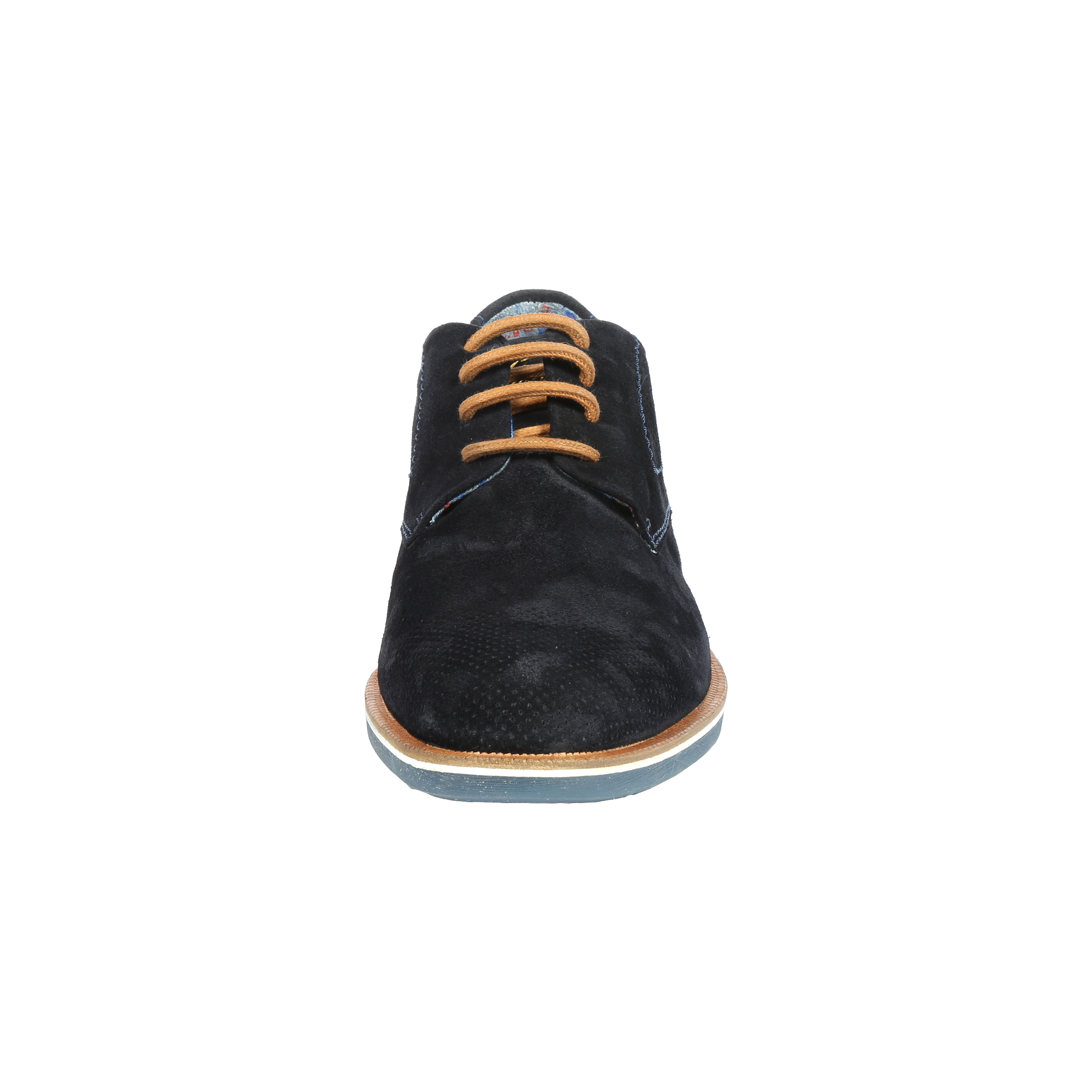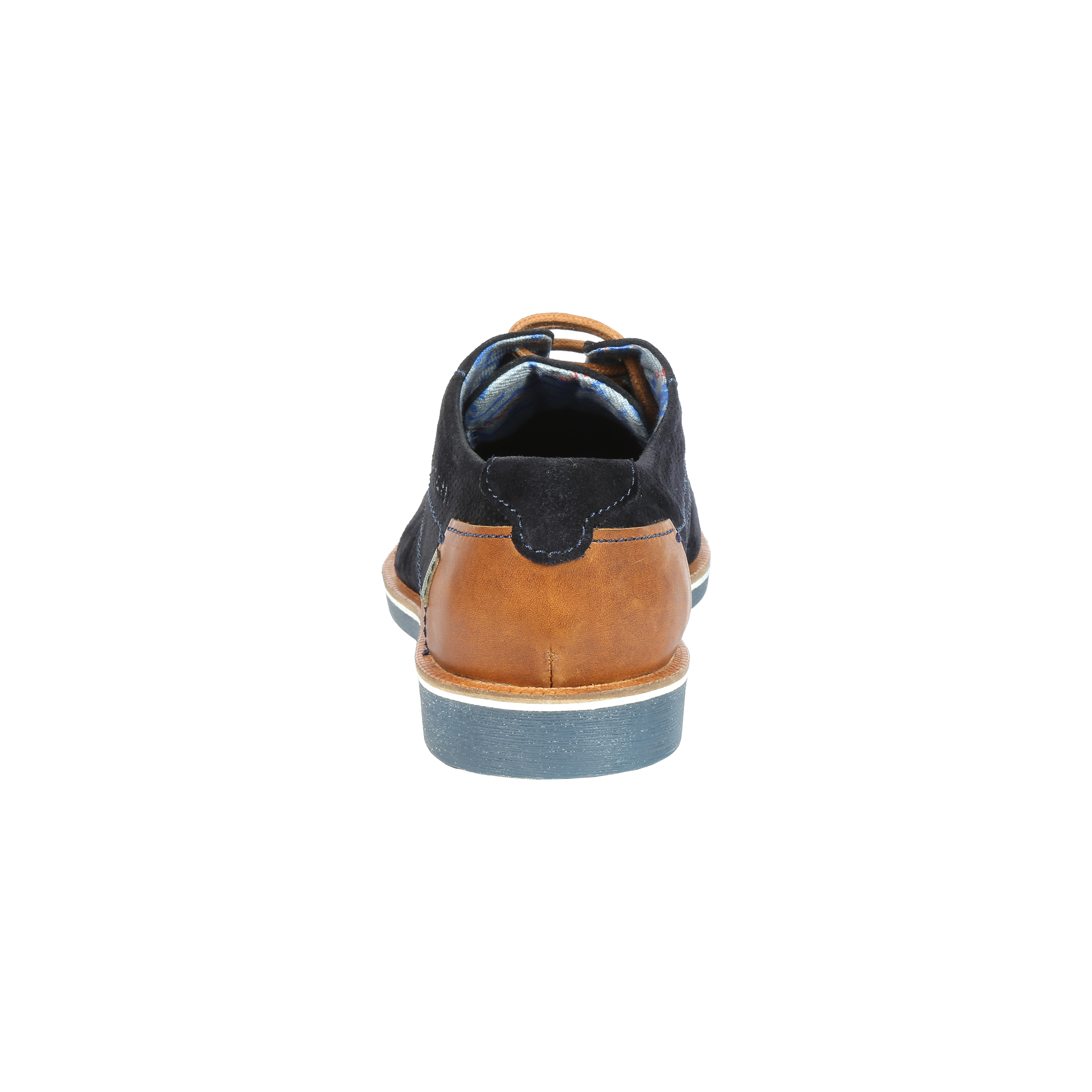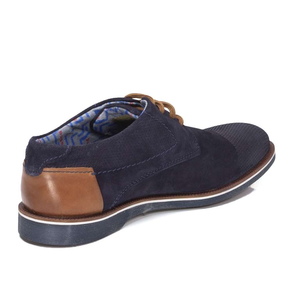 Pánské polobotky v tmavě modré barvě s kulatou špičkou jsou zdobené jemnou perforací ve špici a na stranách, která neprochází skrz celou tloušťku materiálu i hnědým dílem v patě. Šněrování Vám napomůže při obutí. Tento model je velmi pohodlný a dobře kombinovatelný s jakýmkoliv outfitem.