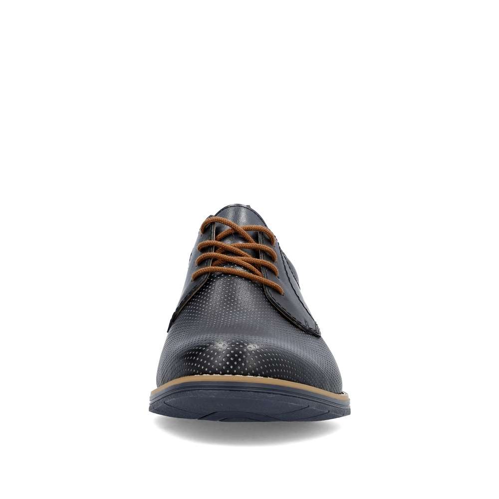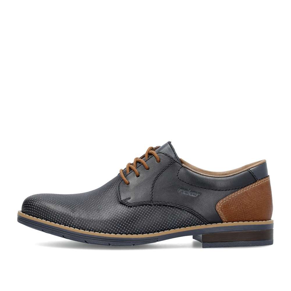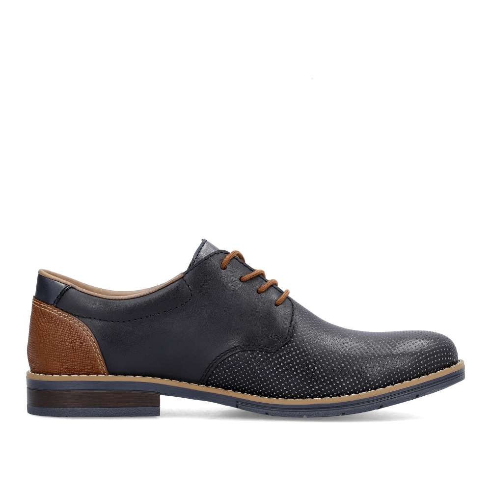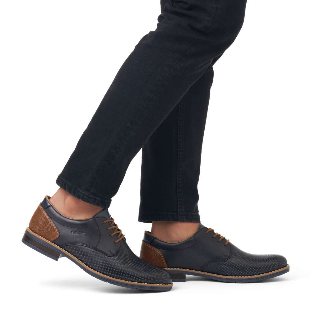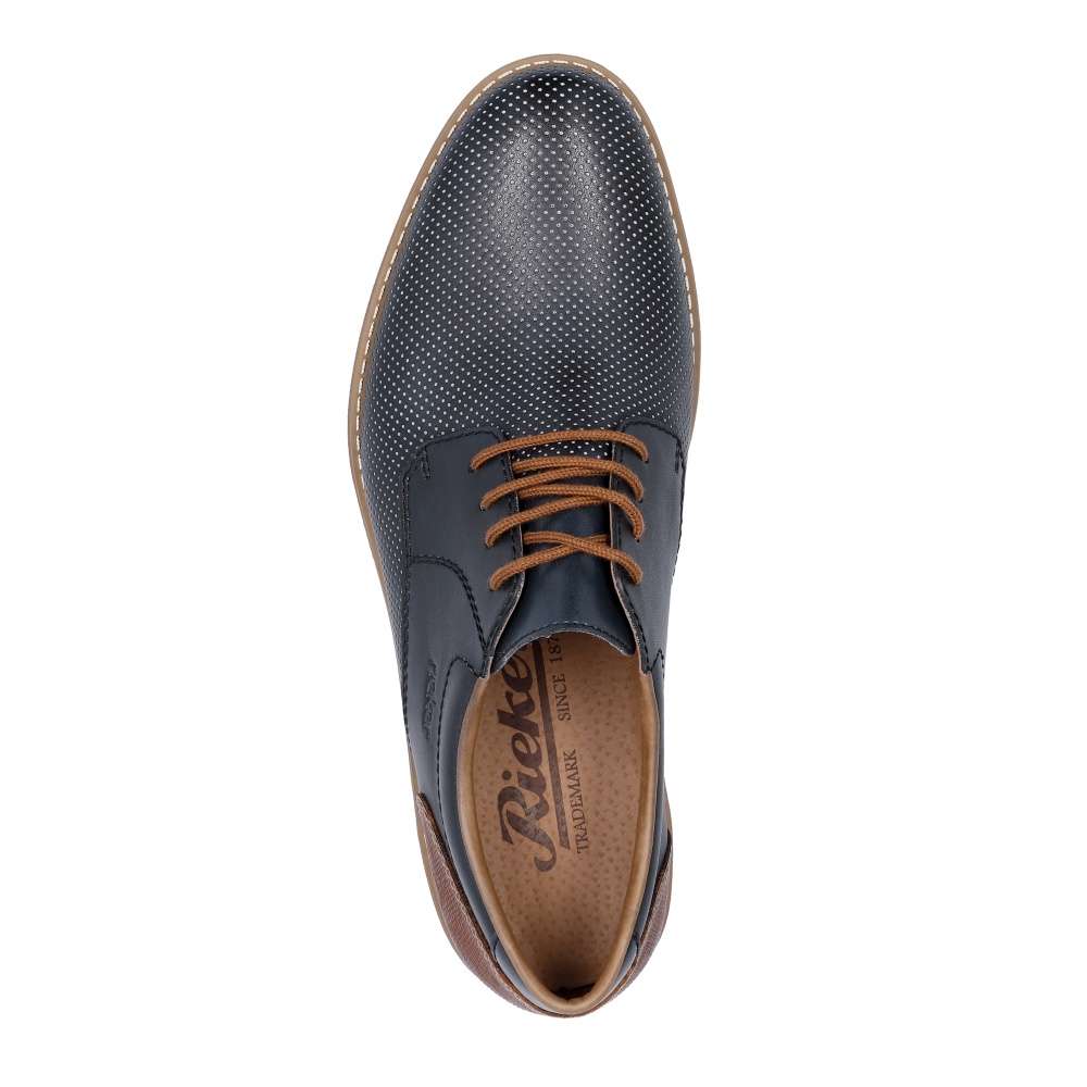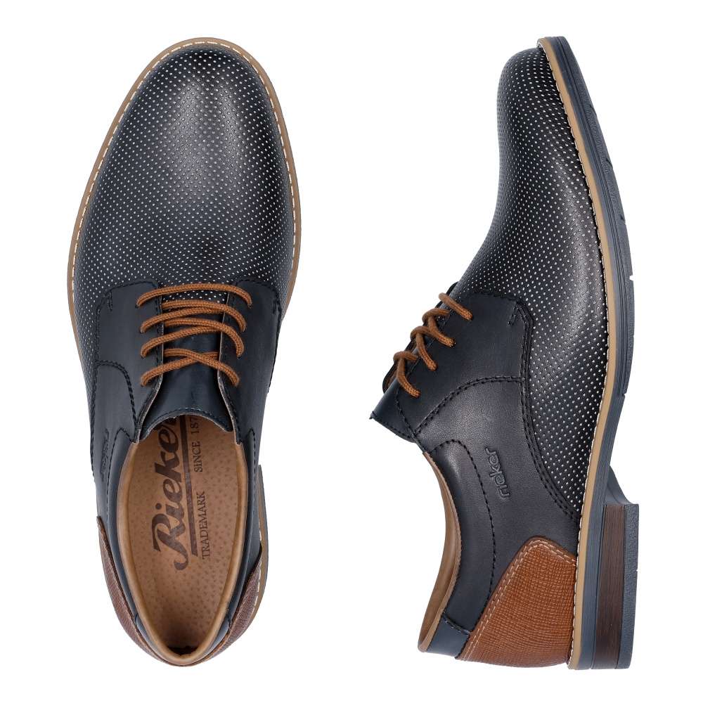 Tyto pánské polobotky značky RIEKER na první pohled zaujmou svým hladkým materiálem zdobným jemným puntíky a kontrastní hnědou patou. Ke snadnému obutí poslouží šňůrky na šněrování, díky kterým si boty snadno přizpůsobíte na své chodidlo. Měkká stélka z pravé kůže Vám zaručí pohodlí po celý den. S tímto modelem si krásně doladíte Váš společenský oblek nebo džíny a košili. Technologie: Antistress – podešev je díky této technologii lehká, flexibilní, absorbuje nárazy při došlapu a snadno se přizpůsobí každé noze.