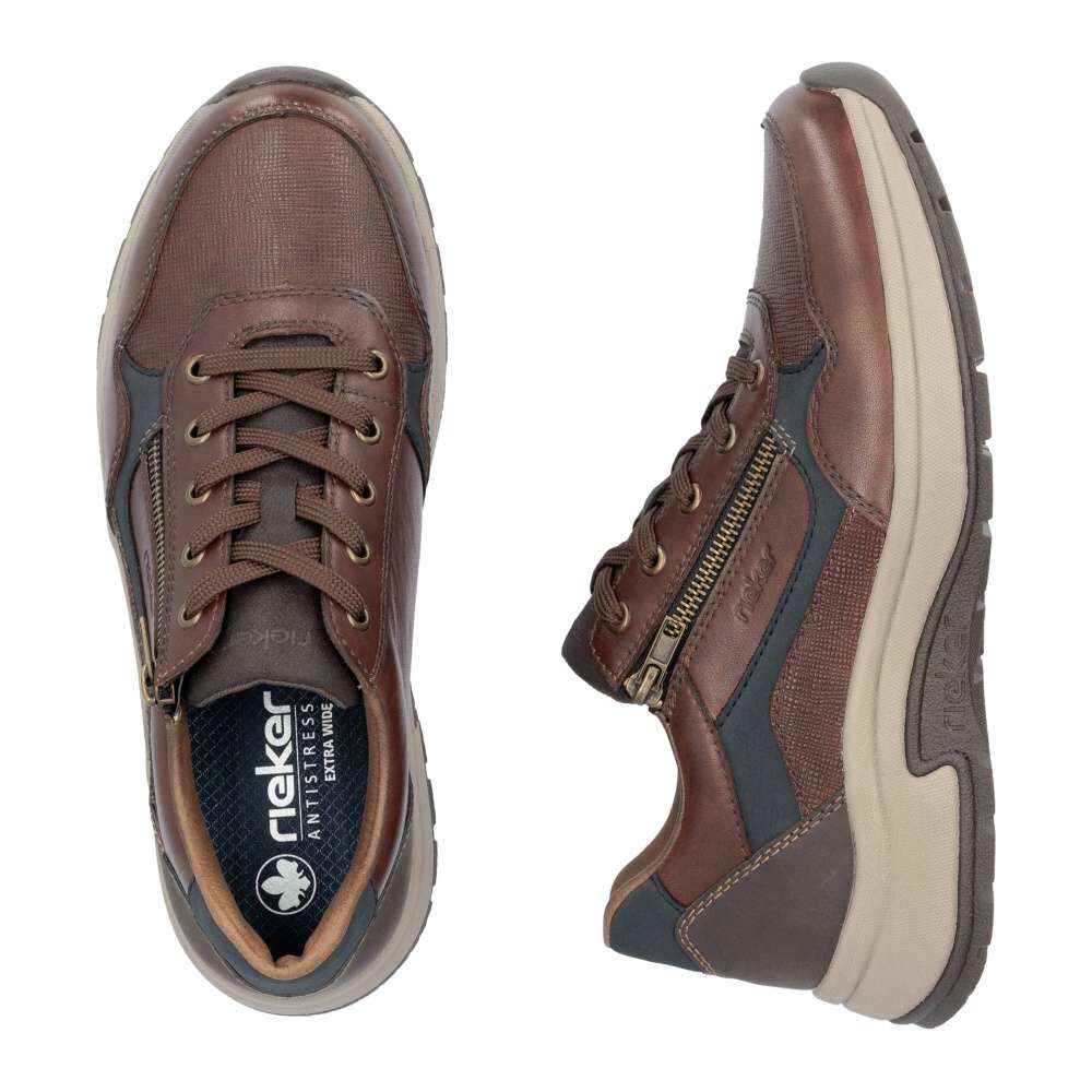 Tento model obuvi značky Rieker bude tou správnou volbou pro moderního muže. Svršek Vás zaujme svým stylovým barevným provedením. Na straně najdete funkční zip, díky kterému si boty budete moct jednoduše a rychle obout. Dále si boty můžete upravit pomocí šněrování. Měkká přizpůsobivá stélka a prostorný střih boty Vám umožní si užívat pohodlnou a komfortní chůzi po celý den. Tyto kotníkové boty snadno sladíte s čímkoliv, stanou se tedy Vaším skvělým společníkem za každé situace. Technologie: Antistress – podešev je díky této technologii lehká, flexibilní, absorbuje nárazy při došlapu a snadno se přizpůsobí každé noze. EXTRA WIDE – boty jsou širokého střihu, který dodá noze dostatečný prostor.