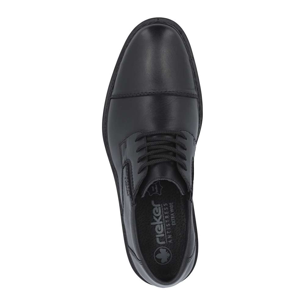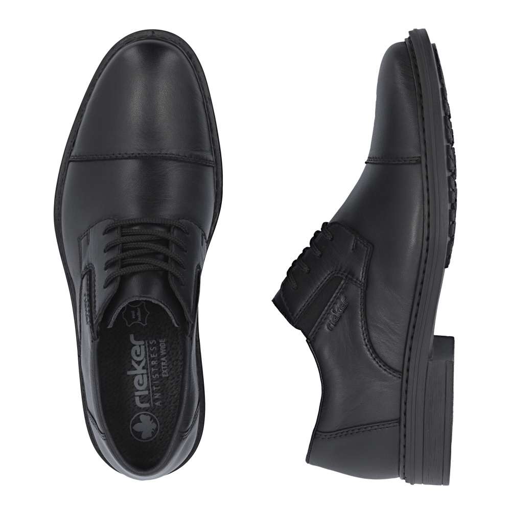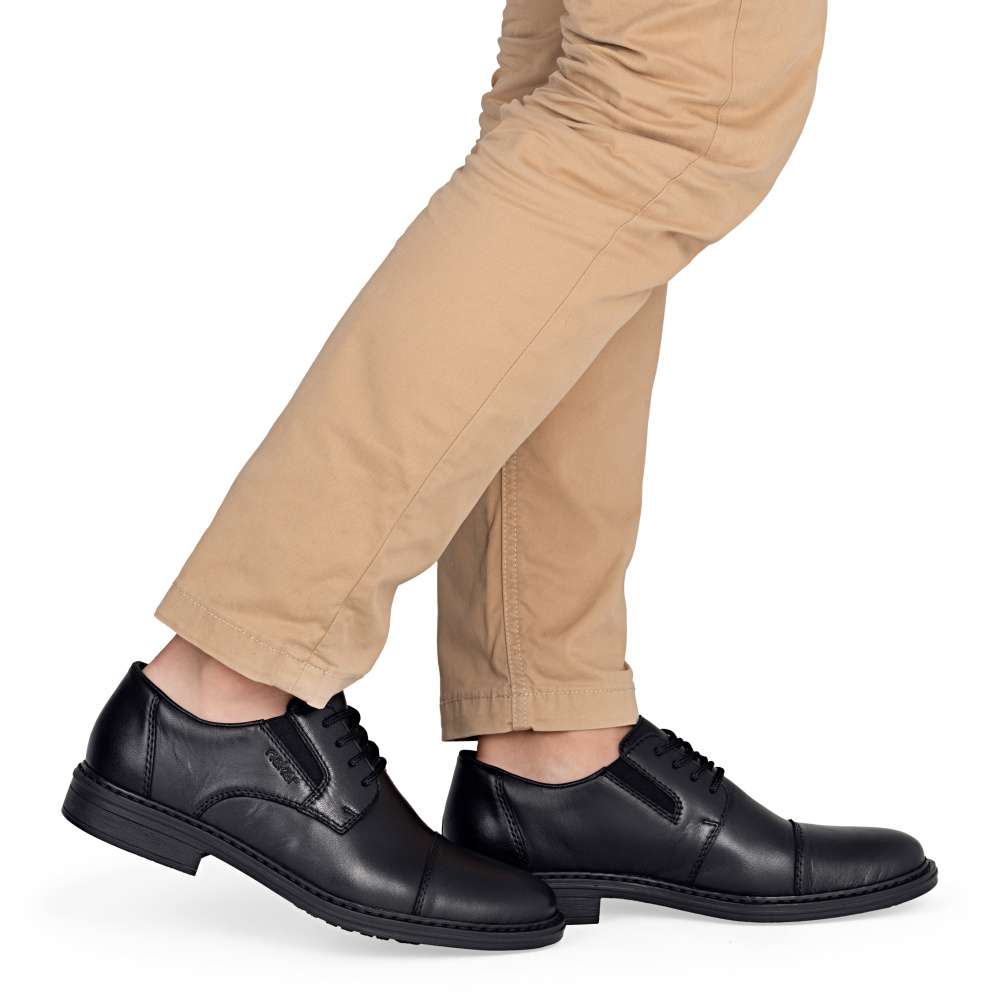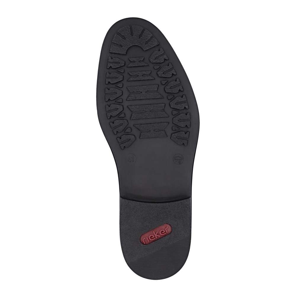 Klasika v moderním stylu značky RIEKER – tyto pánské polobotky v elegantním černém provedení jsou ideální volbou pro muže, kteří oceňují pohodlí a nadčasový design. Jemné linie prošití dodávají botám decentní vzhled, který se snadno kombinuje s formálním i volnočasovým oblečením. Logo značky RIEKER podtrhuje charakteristický rukopis značky a vystihuje její důraz na kvalitu zpracování. Šněrování v kombinaci s pružnými gumičkami po stranách nártu umožňuje snadné obouvání a přizpůsobení tvaru nohy pro maximální pohodlí. Kožená stélka zaručuje příjemný došlap, zatímco širší střih nabízí dostatek prostoru pro přirozený pohyb chodidla. Lehká a flexibilní podešev s tlumícím efektem eliminuje nárazy při chůzi a přispívá k celkovému komfortu. Tento model je dokonalou kombinací stylu, komfortu a funkčnosti – ideální společník do práce i pro volný čas. Technologie: Antistress – díky čtyřem antistresovým vlastnostem – lehkosti, pružnosti, prostornosti a vynikající absorpci nárazů – vám boty RIEKER nabídnou komfortnější chůzi. EXTRA WIDE – boty jsou širšího střihu, tvar boty je přizpůsoben chodidlu pro vytvoření dostatečného prostoru v oblasti přední části chodidla.