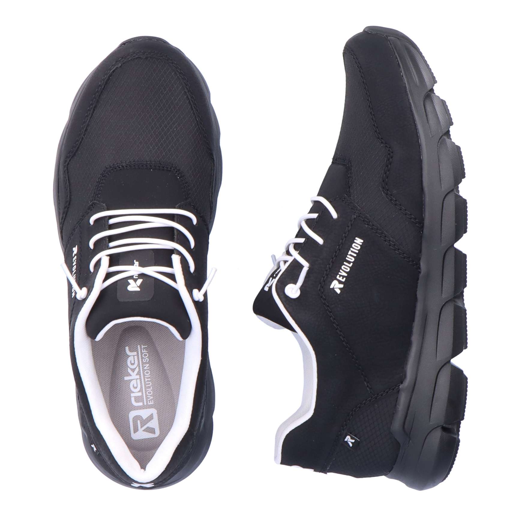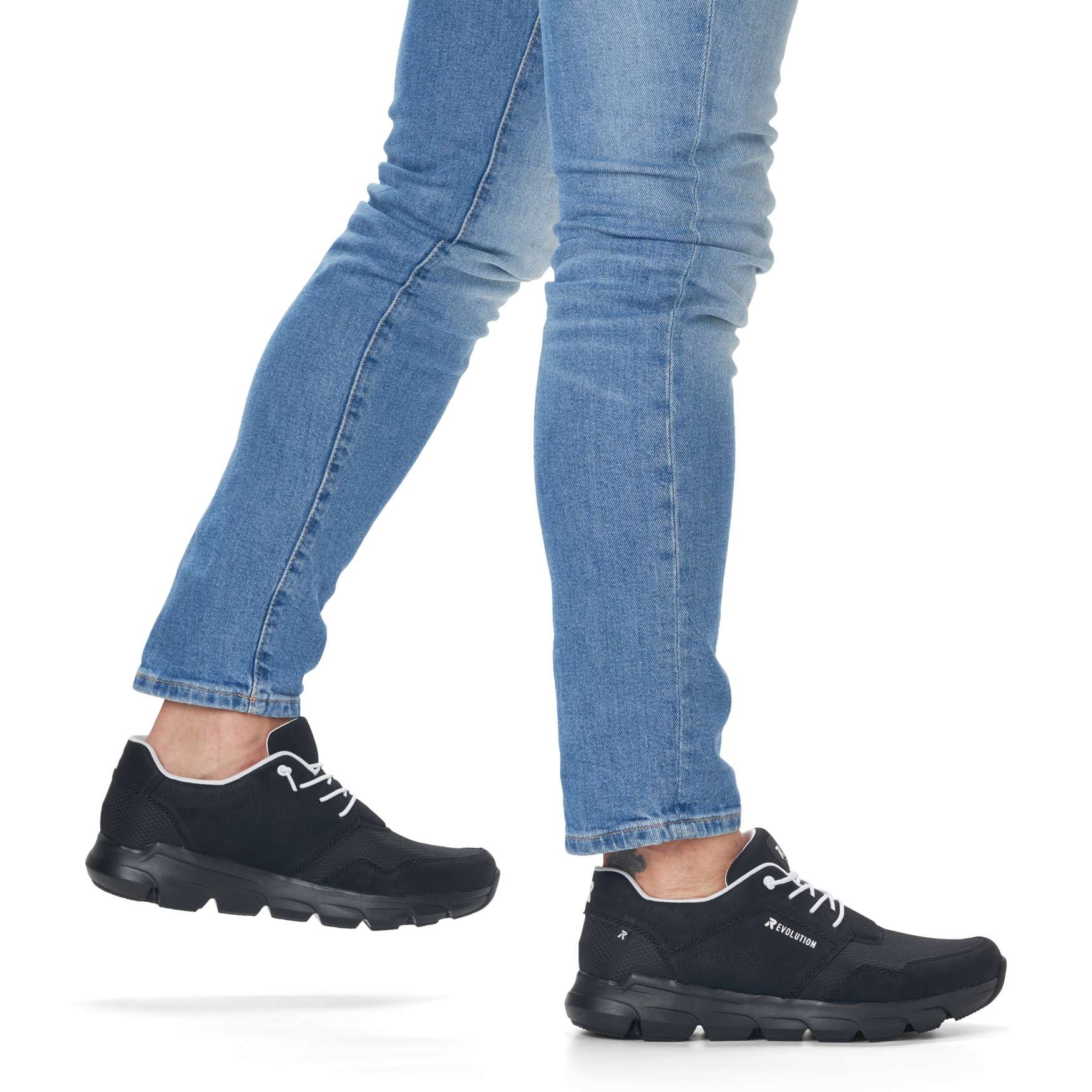 Rieker Revolution je nová řada moderní sportovní obuvi s obrovským důrazem na komfort a pohodlí i při celodenním nošení. Černá klasika v moderním provedení, to jsou tyto tenisky Rieker. Díky jednoduchému svršku zdobenému názvem Revolution z vnější strany, a hlavně netradičním šněrováním bílou gumičkou, ihned upoutají Vaši pozornost. Pohodlná vyjímatelná stélka je vyrobena z paměťové pěny a zajistí Vám celodenní komfort. Už jen si je obout a vyrazit za novými zážitky. Technologie: RevolutionSoft – unikátní stélka z paměťové pěny, která změkčuje došlap, ale také se maximálně přizpůsobí tvaru Vašeho chodidla. Tato bota je vybavena vyjímatelnou stélkou.